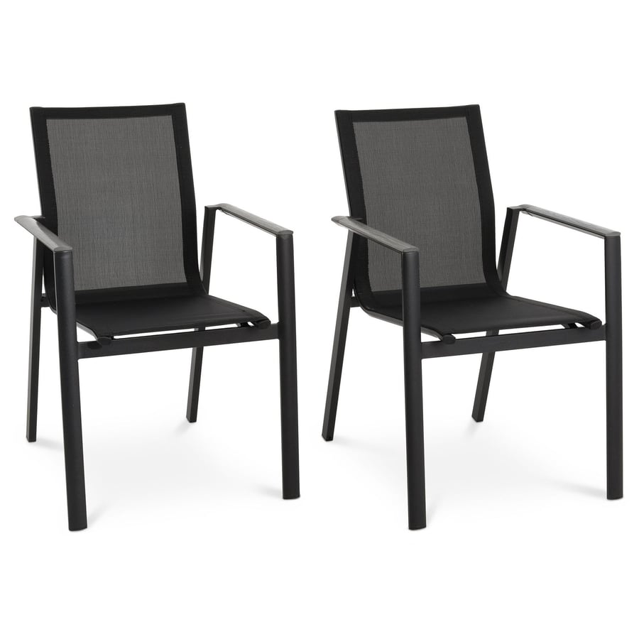 Sada 2 záhradných stoličiek Buti je moderná, praktická a pohodlná sada záhradných stoličiek, ktorá sa bude skvele hodiť do každého vonkajšieho priestoru - na záhradu, terasu alebo balkón. Vďaka kombinácii hliníkového rámu a textílie textilene, z ktorej je vyrobené sedadlo a operadlo, sú stoličky Buti ľahké a mobilné a zároveň veľmi odolné voči poveternostným vplyvom. Minimalistický dizajn čiernej stoličky dopĺňajú sivé podrúčky z polywoodu, ktoré vytvárajú jemný farebný a materiálový akcent. Toto harmonické spojenie moderny a prírodného akcentu dodáva stoličke univerzálny charakter, vďaka ktorému ju ľahko zladíte ku každému aranžmánu a inému záhradnému nábytku.